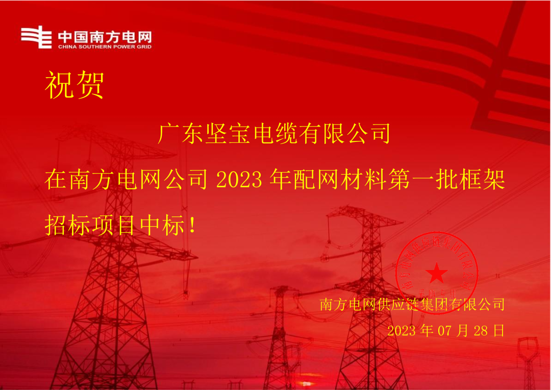 重磅喜报!丝瓜视频看污电缆中标南方电网公司 2023 年配网材料第一批框架招标项目!